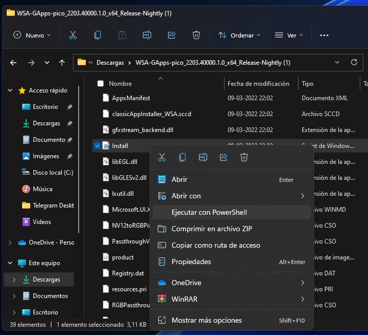 Ahora, ingresa a la carpeta donde quedaron los archivos descomprimidos y busca el archivo llamado “Install”. Selecciona click derecho sobre él y elige la opción “Ejecutar con PowerShell”.
