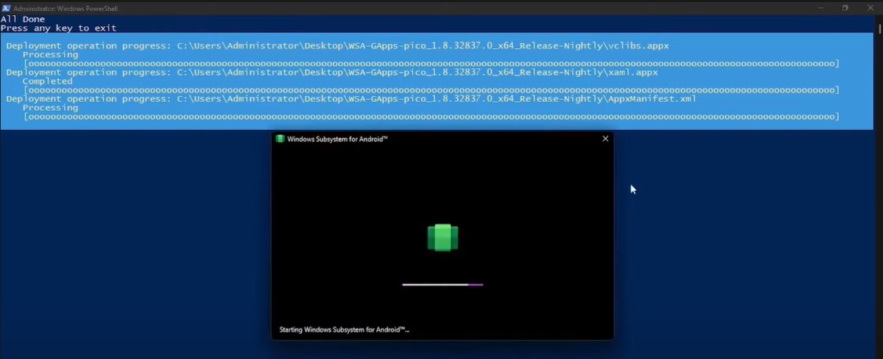 Comenzará a iniciarse la instalación en el sistema. Una vez finalizado, verás que el Subsistema de Windows para Android comenzará a iniciarse. Tu sólo espera a que finalice todo, y luego procede a cerrar la venta de Windows PowerShell.