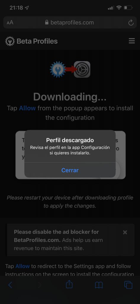 Te deslizas hasta el apartado de iOS 13 + iPadOS, y seleccionas el botón «Download». Te aparecerá el mensaje: «Este sitio está intentando descargar un perfil de configuración. ¿Quieres permitirlo?», tu obviamente seleccionas «Permitir» y te saldrá otro aviso diciendo «Perfil descargado. Revisa el perfil en la app Configuración si quieres instalarlo».