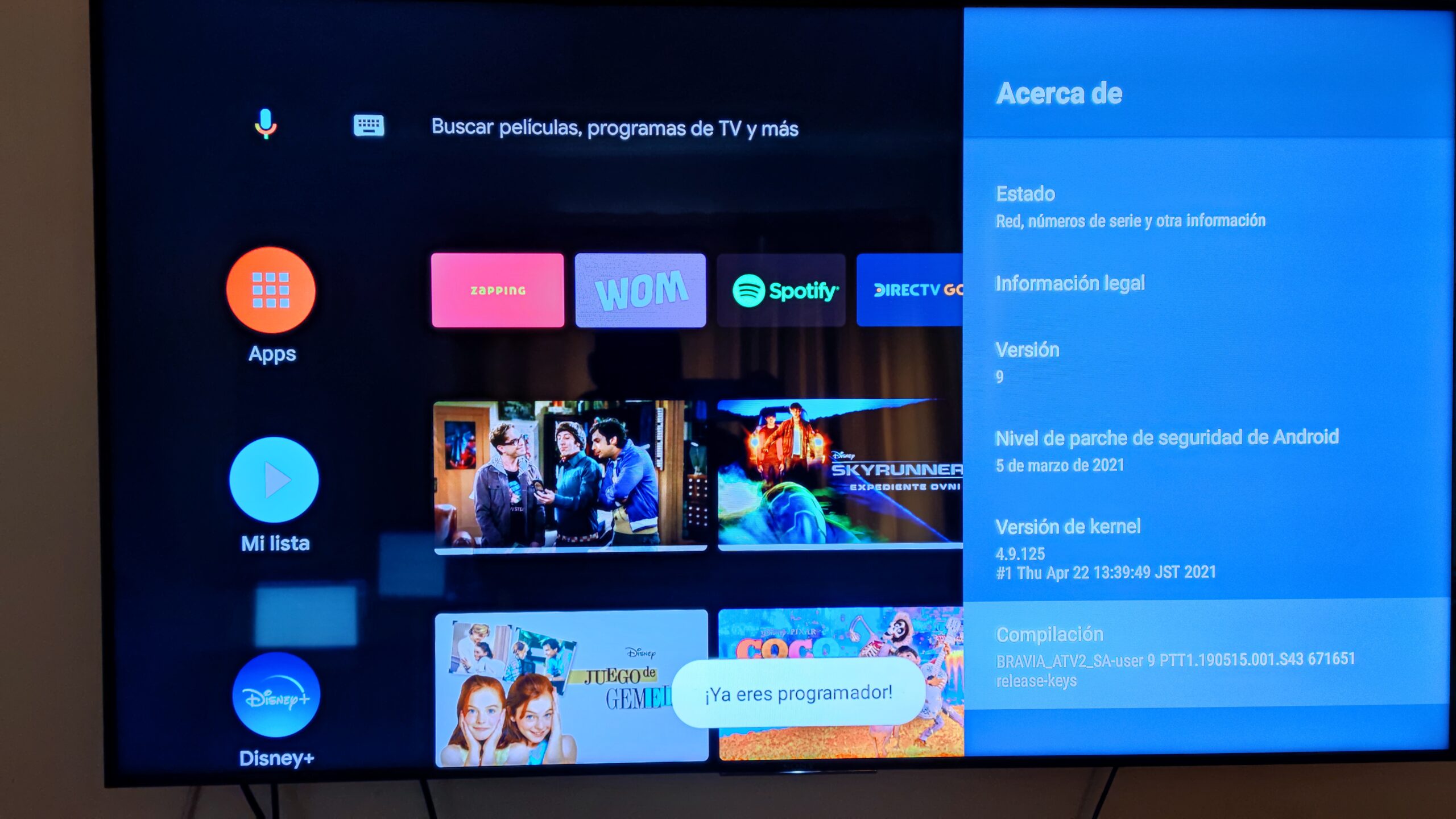 Ahora, nos vamos a ir al menú de configuración de nuestro Android TV, seleccionamos “Preferencias del dispositivo”, seleccionamos “Acerca de”, y buscamos donde dice “Compilación” o “Versión Build” (depende del dispositivo), y presionas cinco veces sobre dicha opción para activar el “Modo de desarrollador o programador”. Cuando lo actives, te aparecerá un mensaje diciendo “Ya eres programador”.
