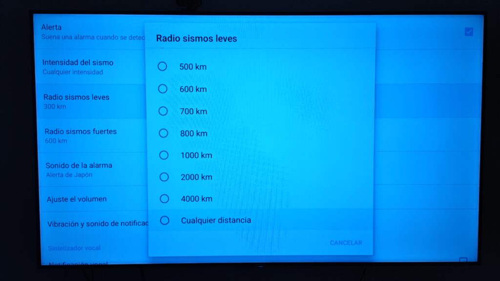Si quieres probar una alerta sísmica de verdad en tu Android TV, te recomiendo que en los ajustes en “Alerta en tiempo real” selecciones la opción “Cualquier distancia” en “Radio sismos leves”, para que así te llegue cualquier alerta sísmica que Sismo Detector detecte. Esto es solo para probar si funciona todo ok.