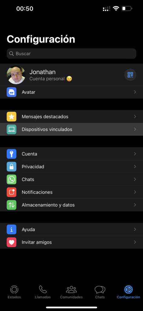 Ahora, debes ir al dispositivo principal, seleccionar la opción “Configuración”, y luego entrar en la opción “Dispositivos vinculados”.