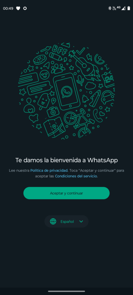 En el otro dispositivo, debemos iniciar WhatsApp (o su versión Business), y aceptar la pantalla de bienvenida.