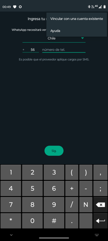 Luego, la app te pedirá tú número de teléfono para activar WhatsApp. Sin embargo, debes tocar en los tres puntos verticales que están en la parte superior derecha de la pantalla, y seleccionar la opción “Vincular con una cuenta existente”.