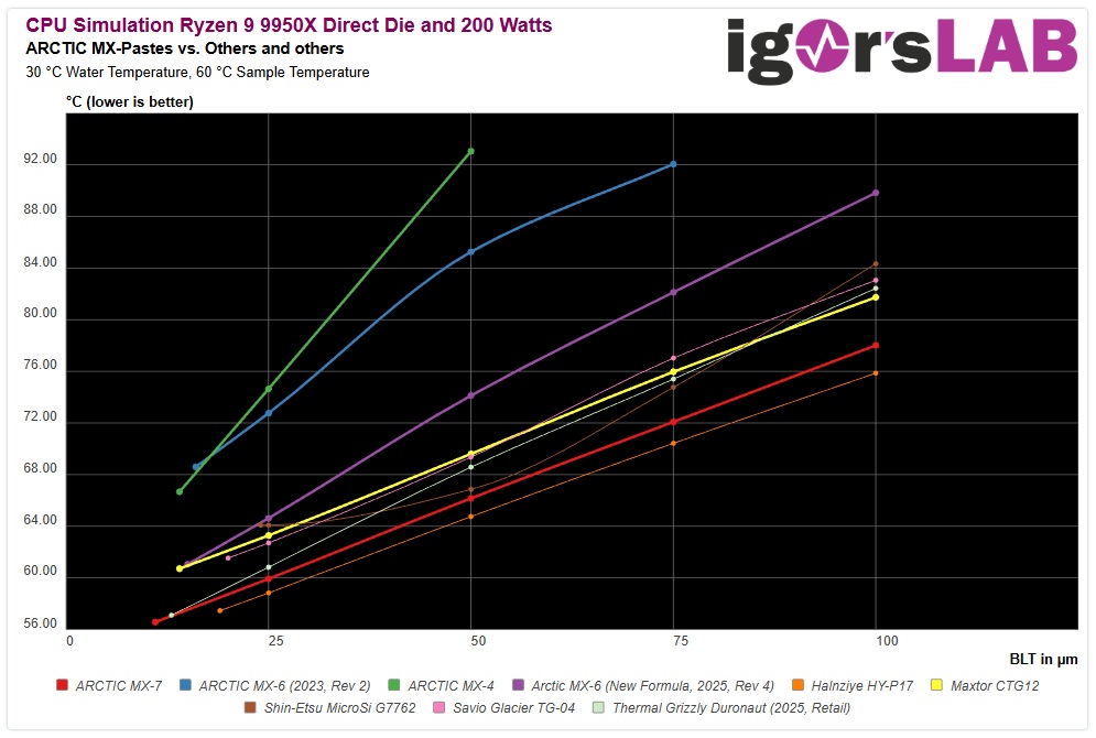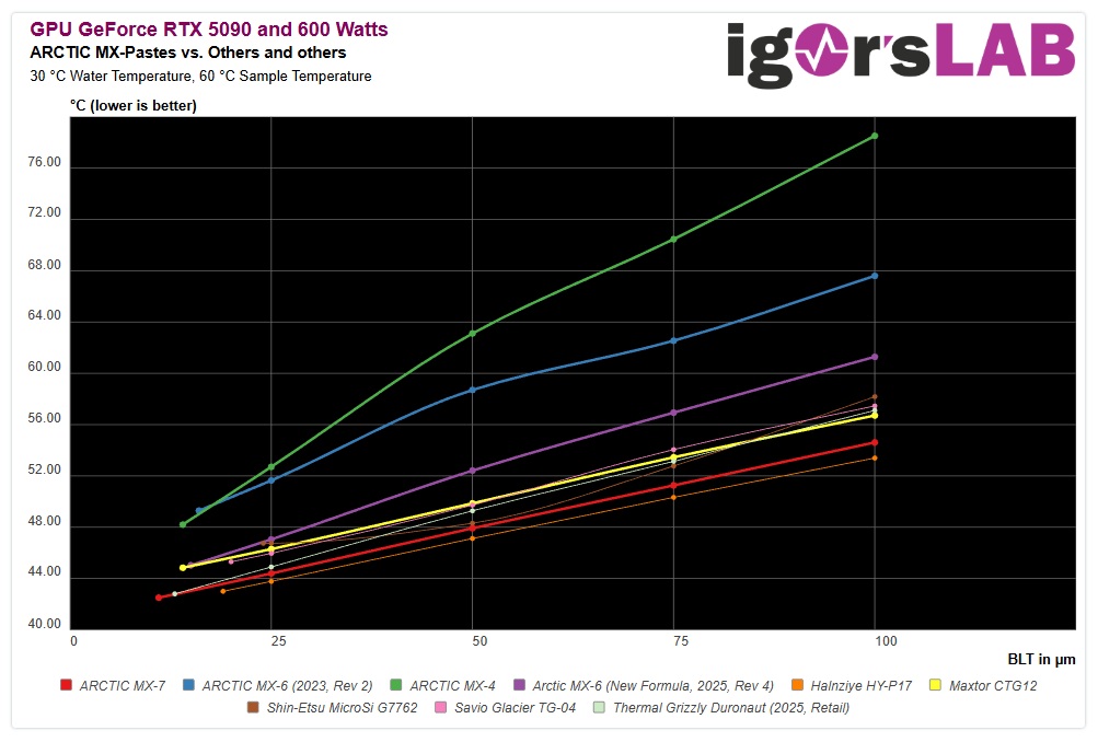 De hecho, recientemente el sitio igorslab puso a prueba la nueva MX-7, comprobando que su conductividad térmica medida es de 6.17 W/mK. También confirmó que su rendimiento es casi a la par de las pastas que declaran conductividad térmica de 12.5 W/mK (ver línea roja de los gráficos). El primero corresponde al uso en una CPU AMD Ryzen 9 9950X, mientras que el segundo en una GPU NVIDIA GeForce RTX 5090.