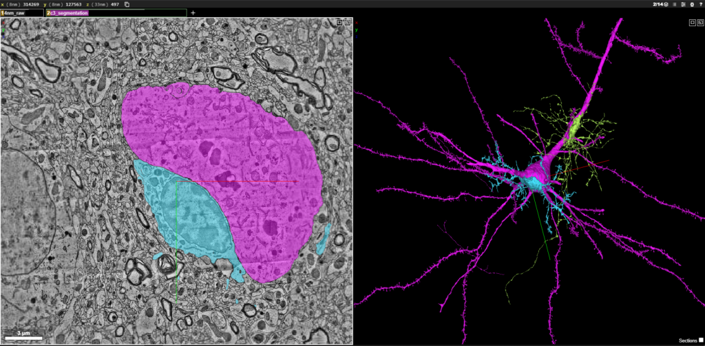 Lo mejor de todo es que esto se puede visualizar y navegar utilizando una interfaz llamada Neuroglancer, la cual cuenta con distintas vistas para apreciar las distintas peculiaridades de la muestra de tejido que ocuparon, pasando por cosas más específicas como vasos sanguíneos o células, hasta por las neuronas, junto con sus respectivos componentes e interacciones entre unas y otras.