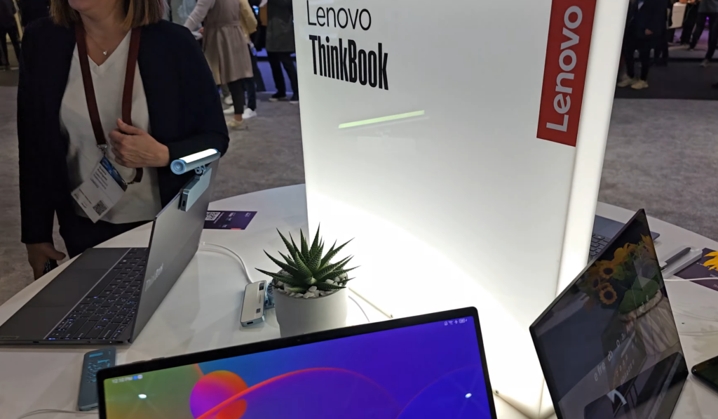 En otra mesa estaban presente los equipos de la línea ThinkBook, con laptops 2 en 1 o los clásicos finos y elegantes dispositivos de la misma serie.