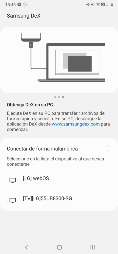 Si tenemos los requisitos anteriores, nos vamos a la barra de notificaciones y en los accesos directos buscamos «Dex». Al seleccionarlo, se nos abrirán las instrucciones para conectarlo de forma convencional y además de un listado de dispositivos para conectarlo de forma inalámbrica. Si elegimos un televisor, por ejemplo, se nos pedirá la autorización en ambos dispositivos.