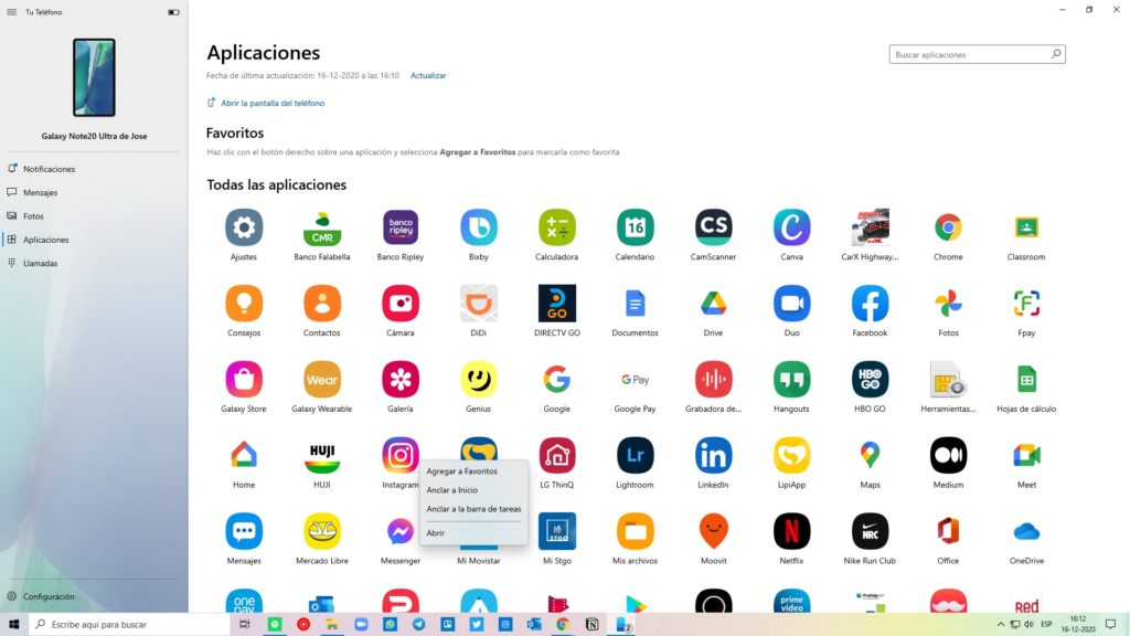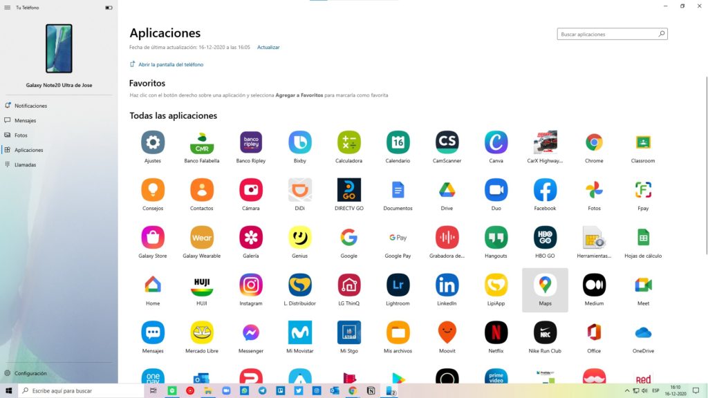 Probablemente este sea el punto central y más llamativo de alianza entre Samsung y Microsoft, el permitir visualizar las aplicaciones de Android en Windows. En esta pantalla encontraremos el listado completo de nuestras aplicaciones y juegos. Ya sea para abrirlas o desde arriba donde dice «abrir la pantalla del teléfono», se nos pedirá que autoricemos la transmisión desde el smartphone. Al hace esto se abrirá una nueva ventana donde veremos la pantalla de nuestro Android pero ahora proyectada en el computador.