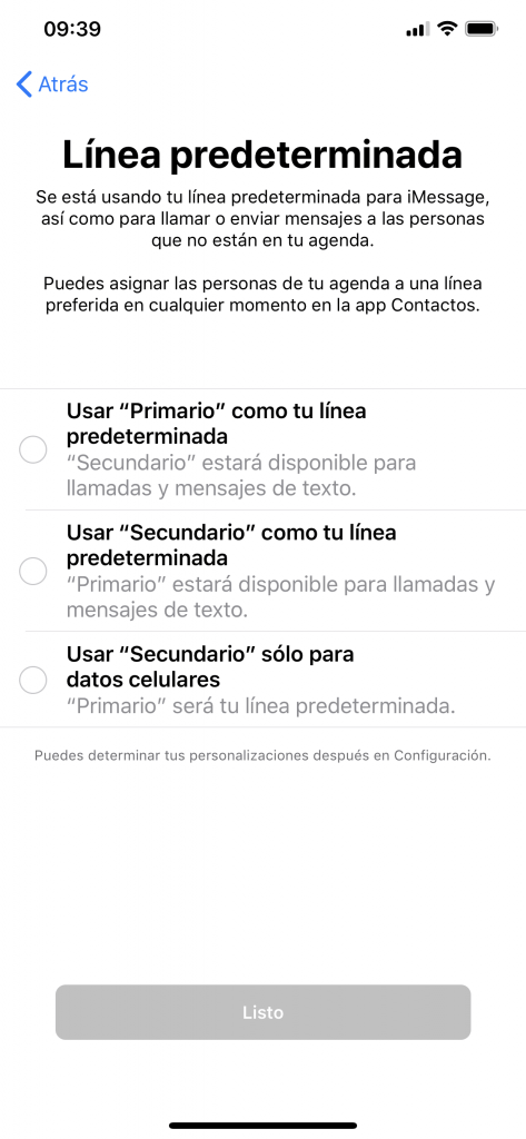 A continuación el iPhone te preguntará cómo quieres usar la eSIM de Movistar y la SIM del otro operador dándote elegir tres alternativas. Esto básicamente te permite decidir qué número vas a usar para tener datos móviles y para usarlo para llamadas y mensajes.
