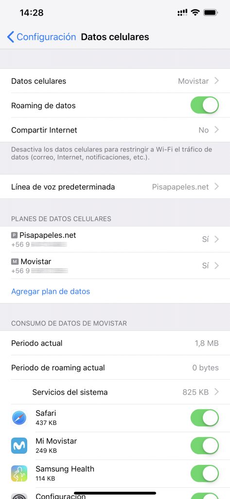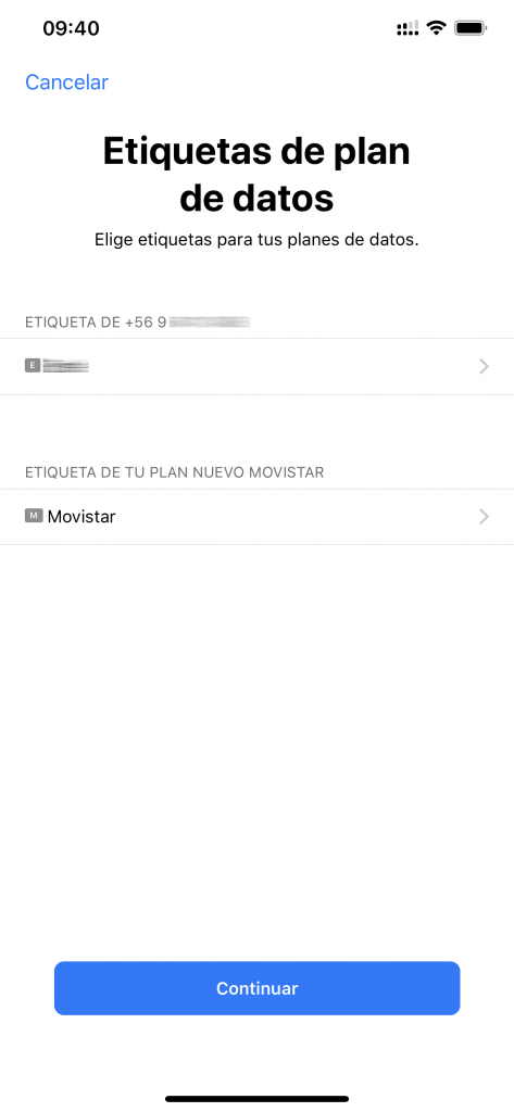 Luego el iPhone te ofrecerá la opción de asignar etiquetas a tus planes. Por ejemplo a la SIM interna puedes asignarle un nombre X (yo le puse «Pisapapeles.net»), mientras que la eSIM de Movistar le pones el nombre de XX (le puse «Movistar»), de esta manera te resultará más fácil reconocer cuál es cual.