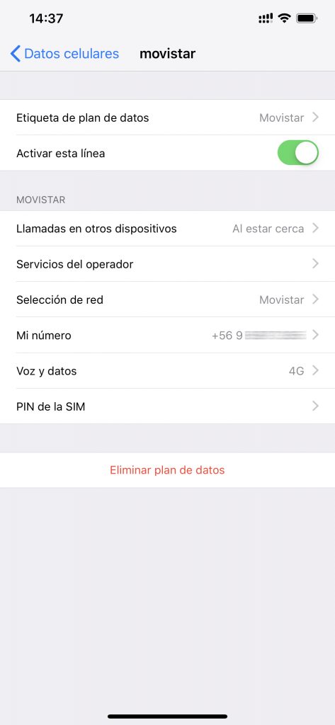 Finalmente vemos el apartado de «Planes de datos celulares» en donde tendremos accesos directos a números y servicios que entrega el operador, así como elegir redes móviles de manera manual, elegir si queremos tener 4G, 3G o 2G, activar o desactivar la línea o simplemente eliminar la eSIM.