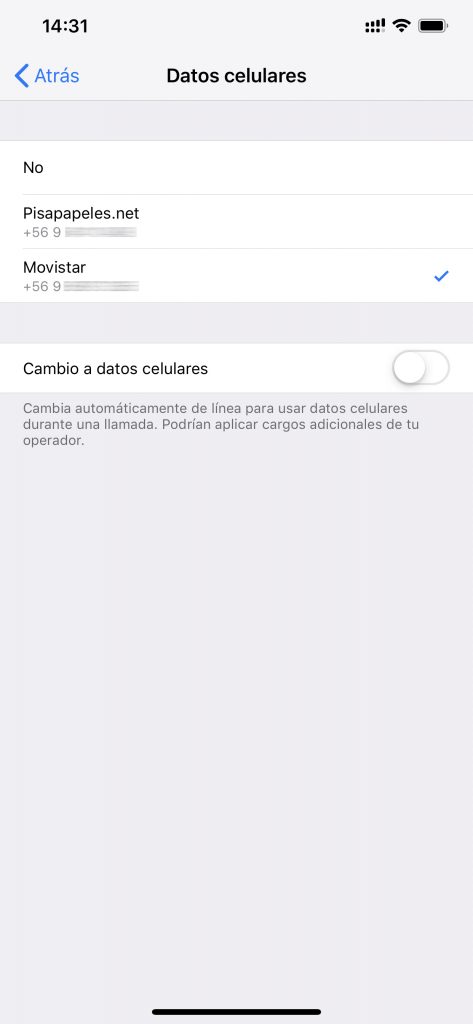 La primera opción que encontrarás en «Datos celulares» te permitirá elegir qué servicio usarás para tener datos móviles o simplemente elegir no usar ninguno.
