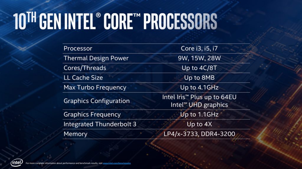 La décima generación de procesadores Intel cuenta con sus tres tradicionales líneas de productos: Core i3 con dos núcleos y cuatro hilos para la gama de entrada, Core i5 para la gama media y Core i7 para la gama más alta. Estos últimos con 4 núcleos y 8 hilos de ejecución, en esta versión.