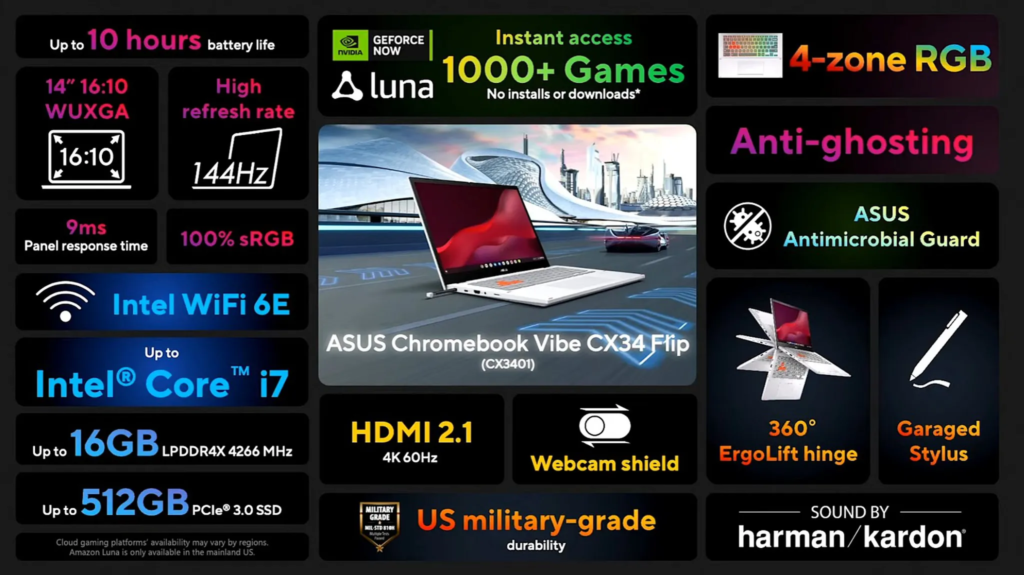 Se trata de la Asus Chromebook Vibe CX34 Flip, la que está diseñada para que podamos disfrutar de los títulos de GeForce Now y de Amazon Luna gracias a su pantalla de 14 pulgadas con tasa de refresco de 144Hz y resolución FHD.