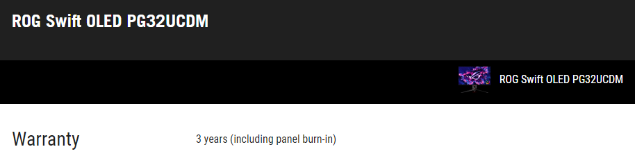 Por esta reciente noticia de MSI, de ofrecer 3 años de garantía en sus monitores, es que ya podemos ver nuevamente cambios en los productos de ASUS, y es así como por ejemplo, modelos ASUS ROG como el ROG Swift OLED PG32UCDM ya cuentan también con 3 años de garantía que incluyen el fenómeno burn-in.