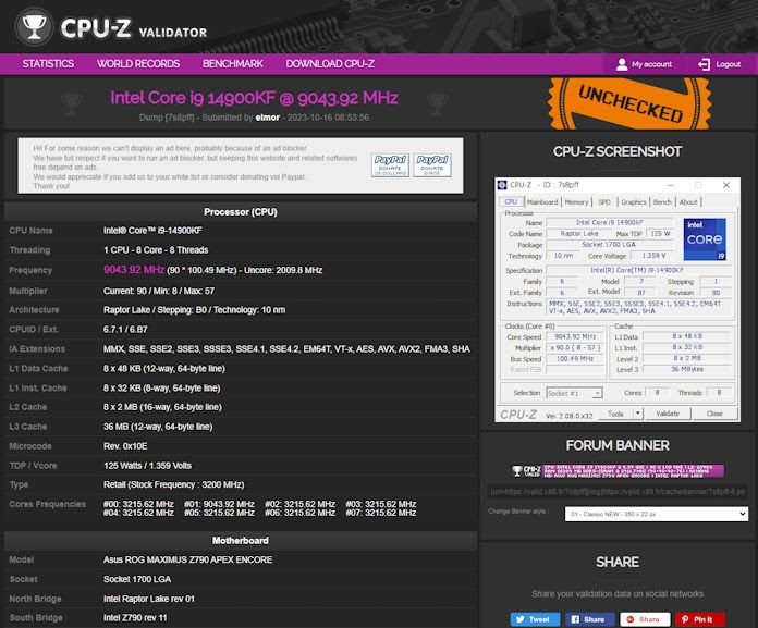 El reconocido overclocker elmor, junto con el equipo de ASUS, llevó al Core i9-14900KF a 9.043,92 MHz. Además, el experto en overclocking Lupin no musume estableció un nuevo récord mundial al hacer funcionar la memoria RAM DDR5 a 11.614 MHz usando la misma placa, superando al segundo lugar por más de 300 MHz.