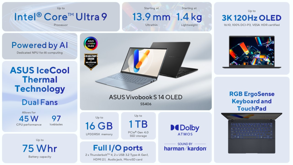 Extrañamente, la variante Vivobook S14 con tecnología Intel tiene un límite de 16 GB de almacenamiento LPDDR5X, mientras que la versión AMD admite 32 GB. Ambos vienen con un SSD NVMe de 1 TB. Sin embargo, la versión de Intel viene con 2 puertos Thunderbolt 4.0, pero los modelos de AMD solo tienen un puerto USB 4.0.