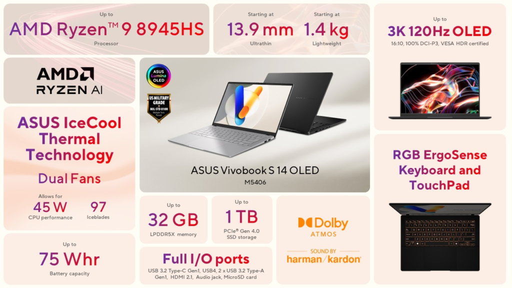 Así, la Vivobook S14 viene ahora en versiones Intel y AMD. Se puede elegir entre un Intel Core Ultra 9 185H y un AMD Ryzen 9 8945HS. Por otro lado, el Vivobook S16 está disponible solo con hardware AMD.