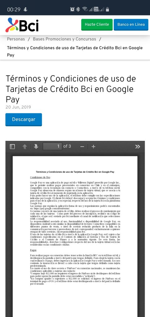 Un informante anónimo nos envió un enlace que nos lleva a la sección de «Bases y concursos» de la web del Banco BCI. Ahí veremos un documento llamado «Términos y Condiciones de uso de Tarjetas de Crédito BCI en Google Pay», el cual tiene como fecha de inicio el 20 de junio del 2019.