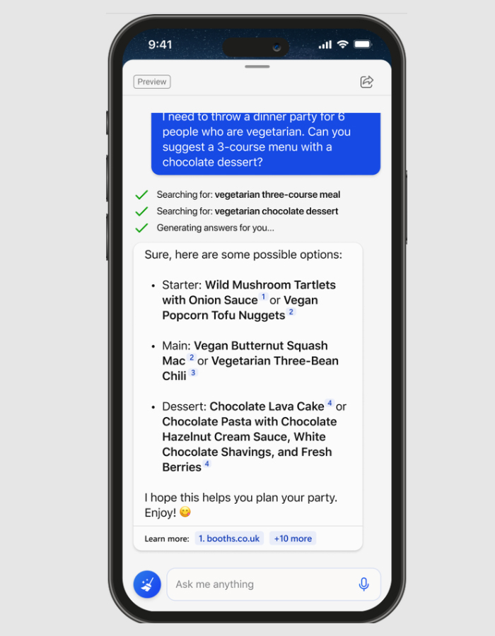 Las personas con acceso a Bing en sus teléfonos podrán tocar su ícono en la parte inferior. Desde allí surgirá una sesión de chat. La experiencia es similar a la de escritorio. Haces preguntas y recibirás respuestas simples o complejas. Además, es posible elegir ver las respuestas como viñetas, texto o respuestas simplificadas.