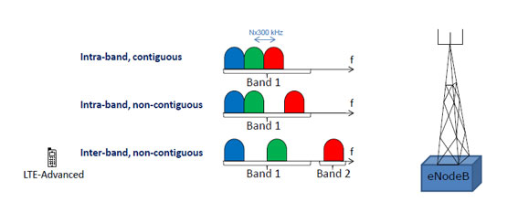 Para realizar agregación de portadoras se pueden utilizar hasta 5 para completar un ancho de banda de hasta 100 MHz, esto se debe a que cada portadora debe tener un ancho de banda específico de 1.4, 3, 5, 10, 15 o 20 MHz, estas portadoras pueden estar dentro de una misma banda o en bandas distintas, es decir, puede ser intra-banda contiguo o no contiguo o inter-banda, que es lo equivalente a tomar portadoras de dos bandas distintas, en el caso de Chile, sería tomar portadoras de la banda 7 y 28. La única limitación para la agregación intra-banda es que las portadoras estén separadas por Nx300 kHz, siendo N un número Natural, si es interbanda sólo debe haber una o más portadoras entre las agregadas.