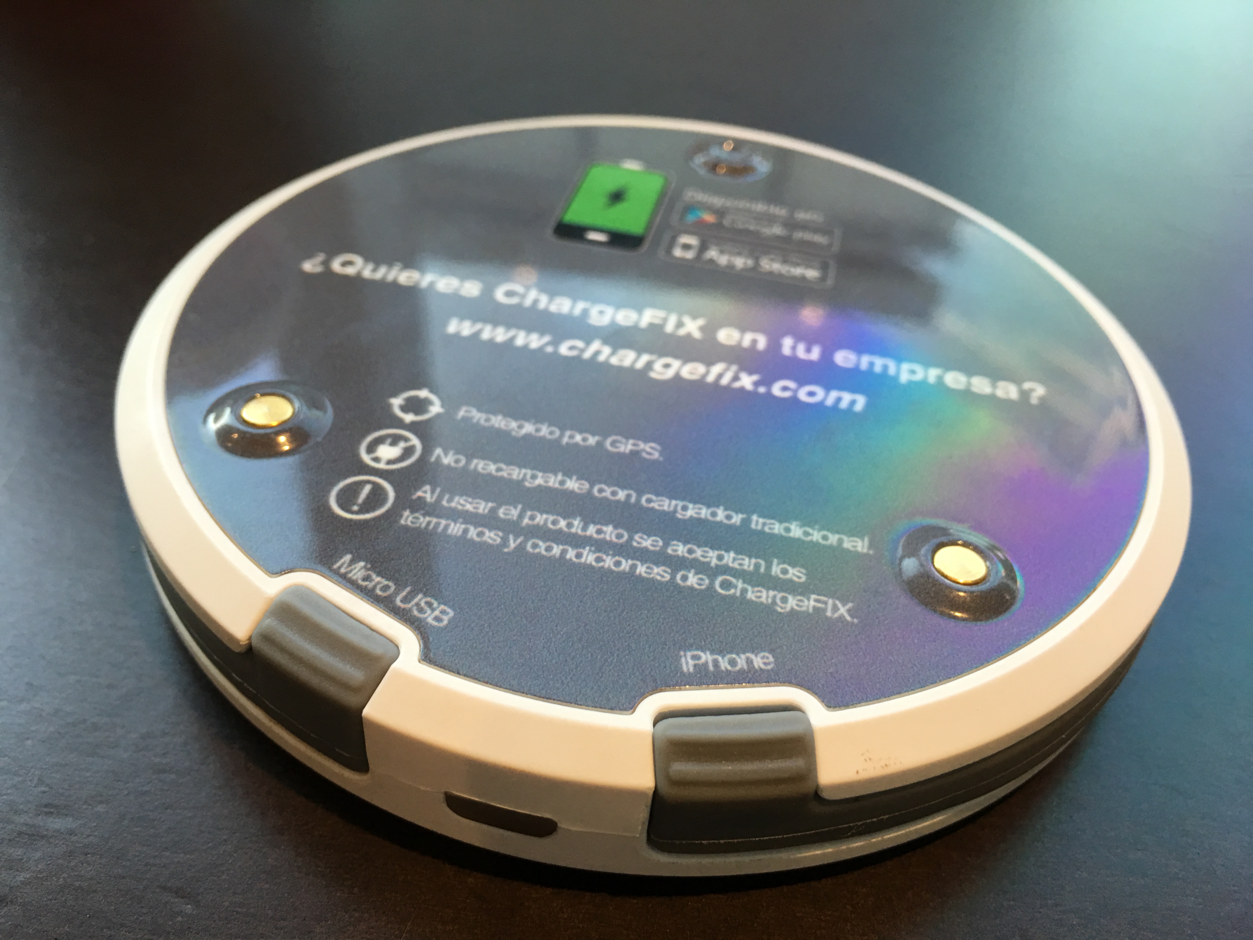 Pregunté en el mesón y me entregaron un disco que parecía un posavasos con el logo de la cafetería y dos cables. Se trataba de ChargeFIX, una batería externa con conexiones para equipos con microUSB y Lightning, por lo que es apto para cargar prácticamente cualquier equipo que andes trayendo.