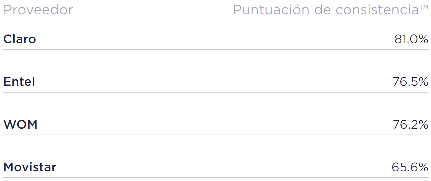 Según lo informado por Speedtest, al medir la consistencia del desempeño de cada operador, se llegó a la conclusión de que el operador Claro tuvo el puntaje de consistencia más alto en Chile durante el cuarto trimestre del 2021 con un 81.0%, mostrando una velocidad de descarga mínima de 5 Mbps y una velocidad de carga mínima de 1 Mbps.