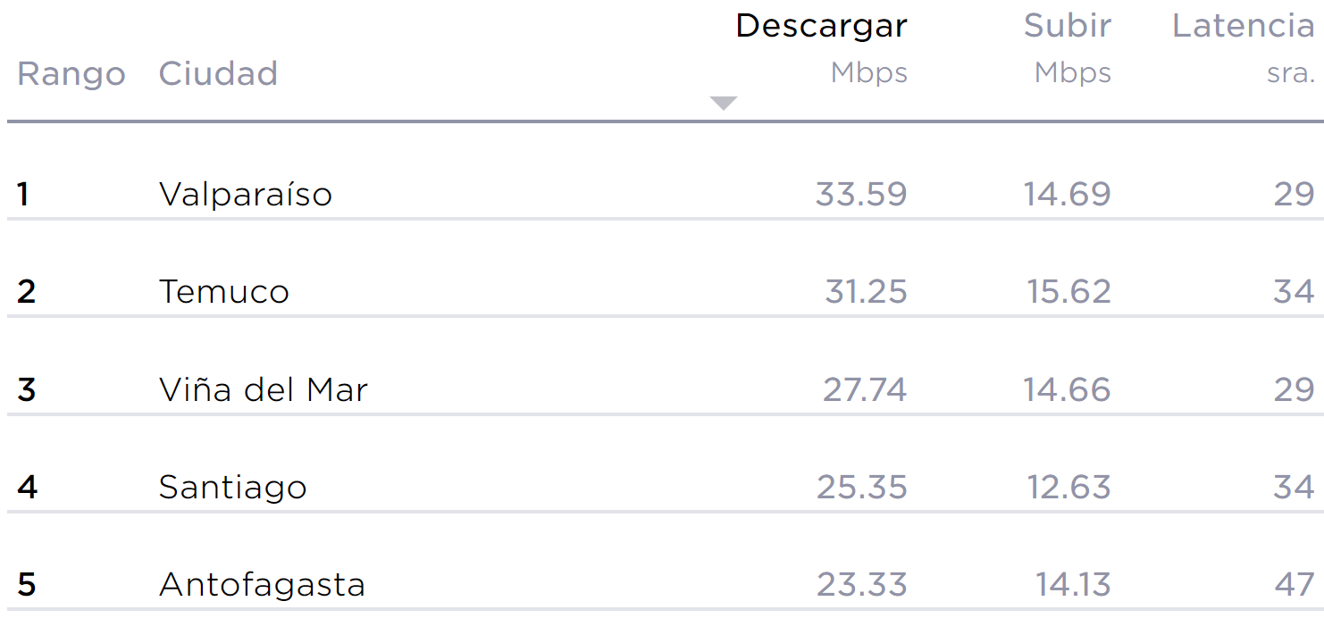 Finalmente, vamos a conocer la ciudad donde se obtuvo la mejor velocidad de descarga móvil durante el cuarto trimestre del 2021. Acá el ganador fue Valparaíso con 33,59 Mbps de descarga.