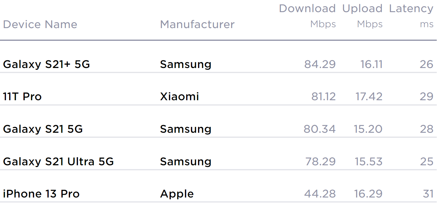 Por acá vamos a conocer el smartphone que más velocidad de descarga obtuvo durante el cuarto trimestre del 2021. El ganador fue el Samsung Galaxy S21+ 5G con una velocidad de descarga promedio de 84.29 Mbps.