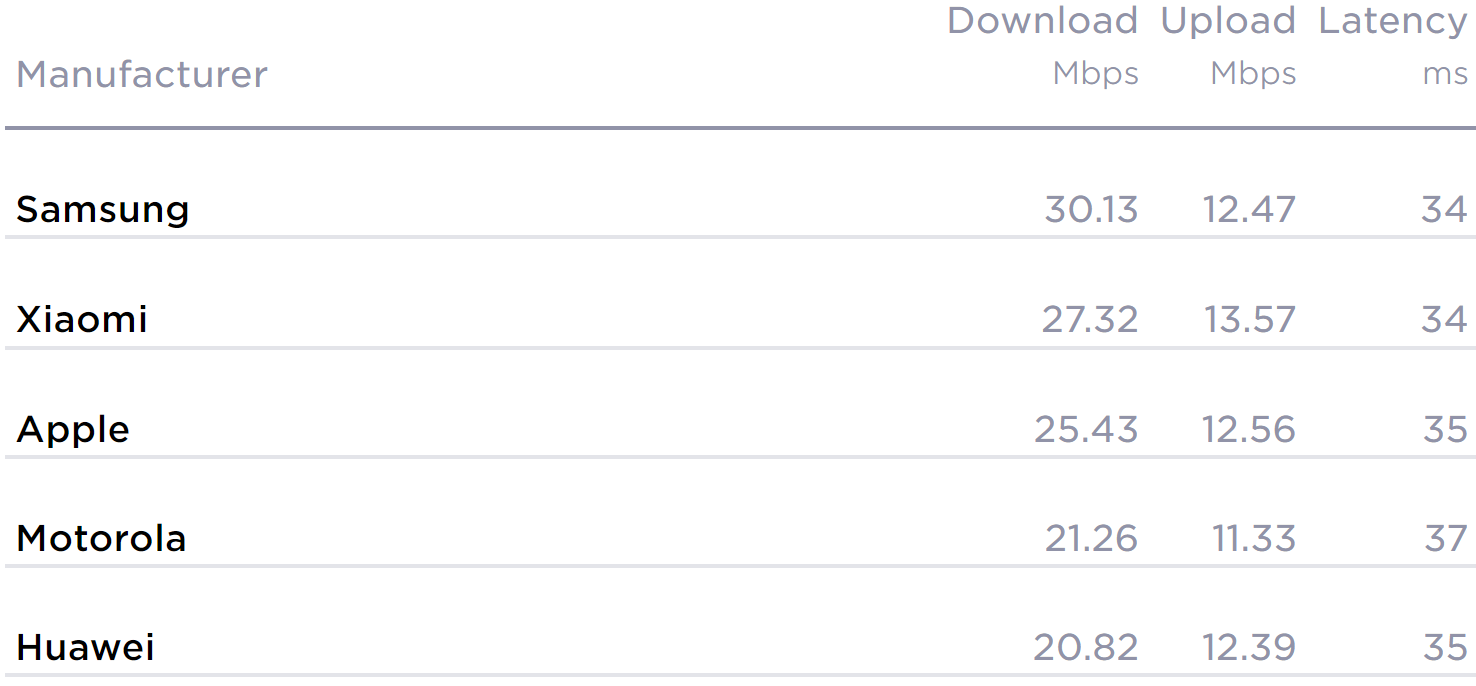 Por acá veremos al fabricante que mejor rendimiento ofrecieron en estas pruebas. Sin embargo, Samsung fue el que mejor velocidad de descarga promedio ofreció en el cuarto trimestre del 2021 con 30.13 Mbps.
