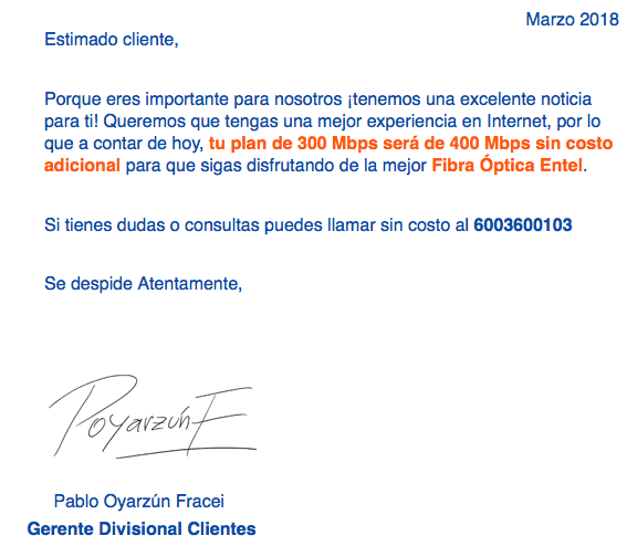 Ahora lo que está haciendo Entel es actualizar a sus clientes que contrataron las velocidades anteriores, pasando de 150Mbps a 200Mbps, mientras que los que tenían 300Mbps pasaron a tener 400Mbps y todo sin costo adicional, tal cual como lo demuestra el correo enviado: