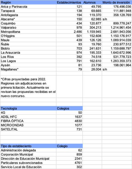 El proyecto se dividió en 54 zonas de concesión y en dos etapas de implementación. La primera de ellas, que es la que ahora comienza, contempla la conexión de 8.325 colegios al primer trimestre del 2022. De estos, 2.486 corresponden a la Región Metropolitana y 5.839 al resto del país. De hecho, existen 2.586 establecimientos que tendrán conexión por primera vez.