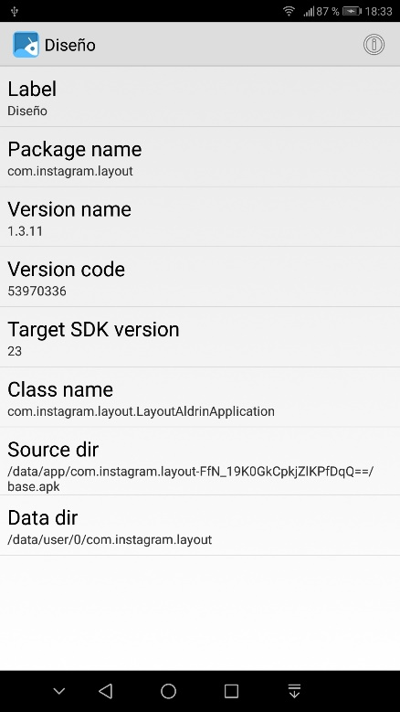 En este caso se seleccionó la app Diseño de Instagram, y el nombre interno del paquete es com.instagram.layout como se muestra en el apartado Package name.