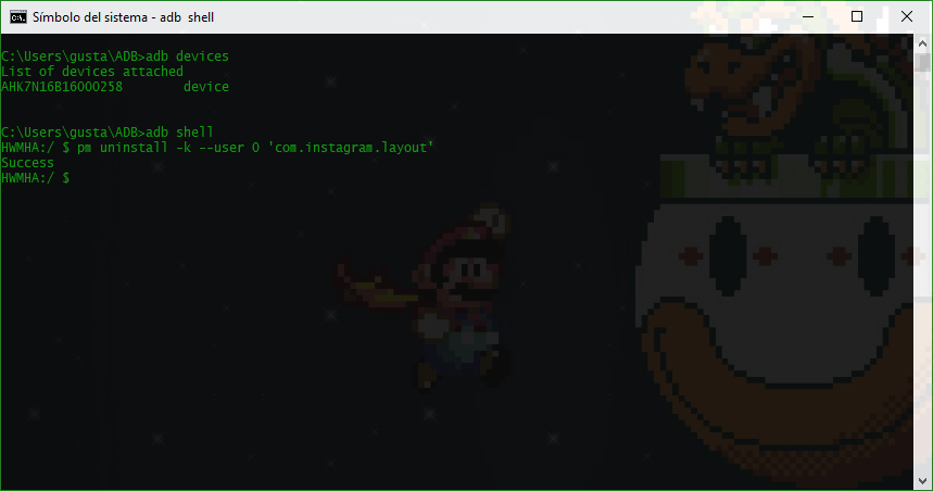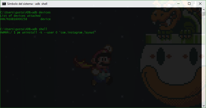 pm uninstall -k –user 0 ‘com.instagram.layout’