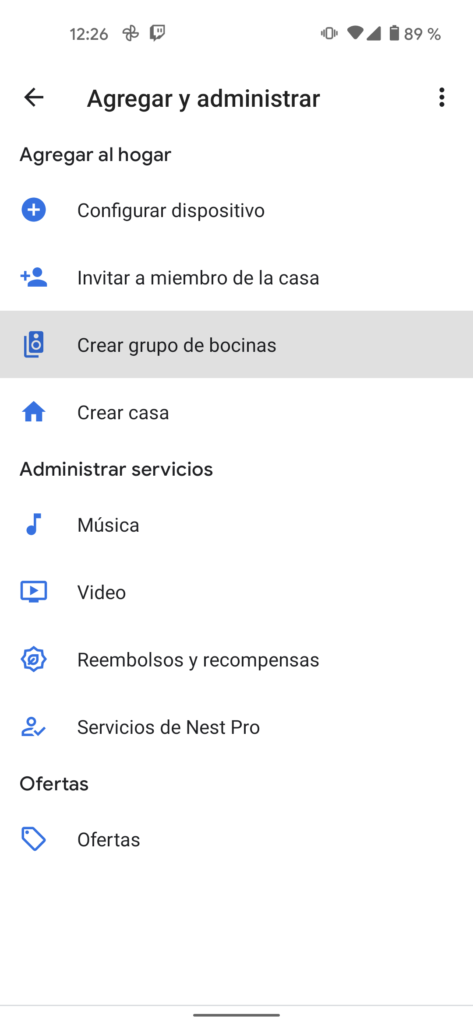 El proceso es bastante simple, una vez que los parlantes estén configurados bajo la misma red WiFi y aparezcan en tu aplicación de Google Home –que es la encargada de configurarlos– solamente debemos ir a la parte superior izquierda de la aplicación y presionar el botón «+» (más) para acceder al menú de agregar y administrar.