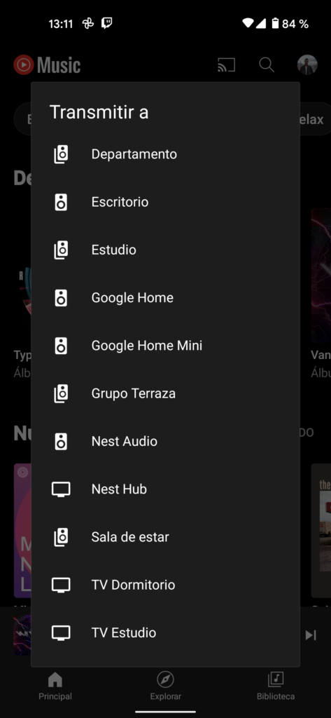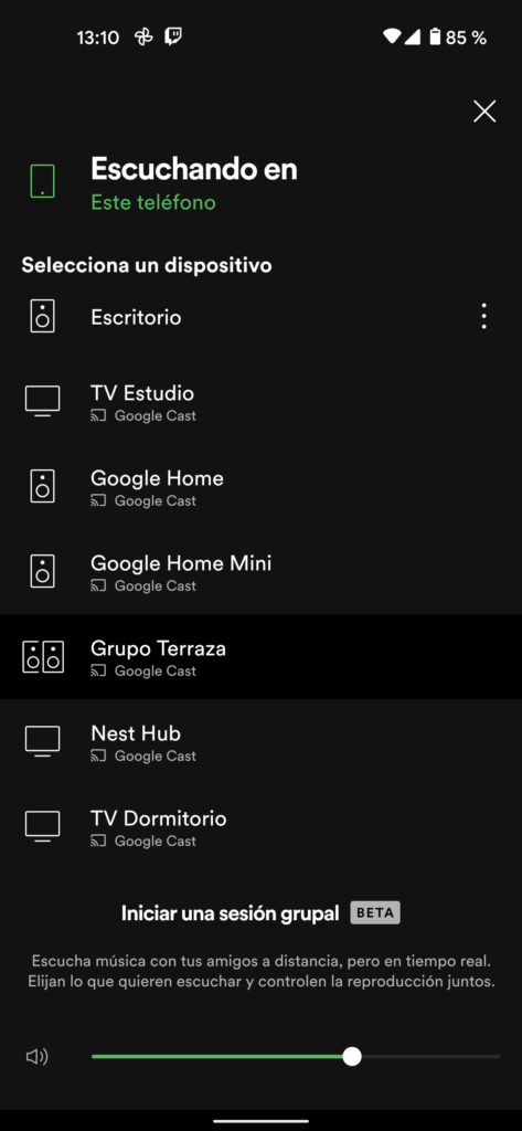 Una vez creado el grupo de parlantes, solo debemos ir a cualquier aplicación que sea compatible con Chromecast, como puede Spotify, Apple Music o YouTube Music y al presionar el icono para transmitir, en el listado de dispositivo aparecerá el grupo creado como si se tratase de un solo dispositivo.