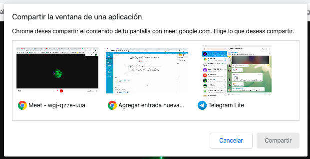 - Mostrar pantalla: Si preferiste entrar con tu cámara, pero llega el momento en que quieres compartir tu pantalla, debes ir a la zona inferior, y elegir entre las opciones «toda la pantalla» o «una ventana». En el caso de esta última te abrirá un menú para que selecciones la aplicación que quieres mostrar a los demás.