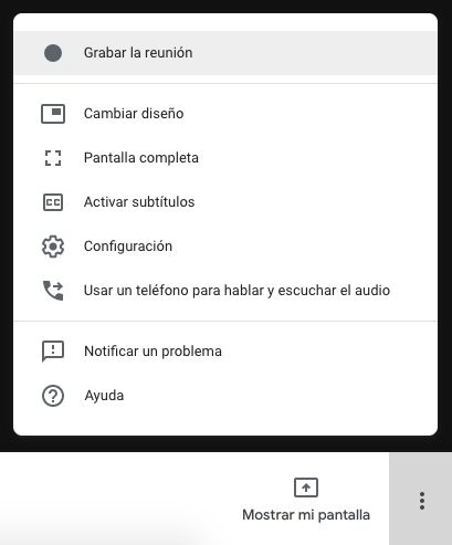 - Grabar la reunión: Si queremos grabar la conversación para luego poder compartirla debemos seleccionar esta opción. Una vez que terminamos de grabar -se detiene del mismo lugar- el archivo de la grabación quedará guardado en nuestra Drive de Google. Ante de iniciar la grabación te aconsejará pedir el consentimiento de los demás participantes, cuando ya esté grabando les avisará que lo estás haciendo.