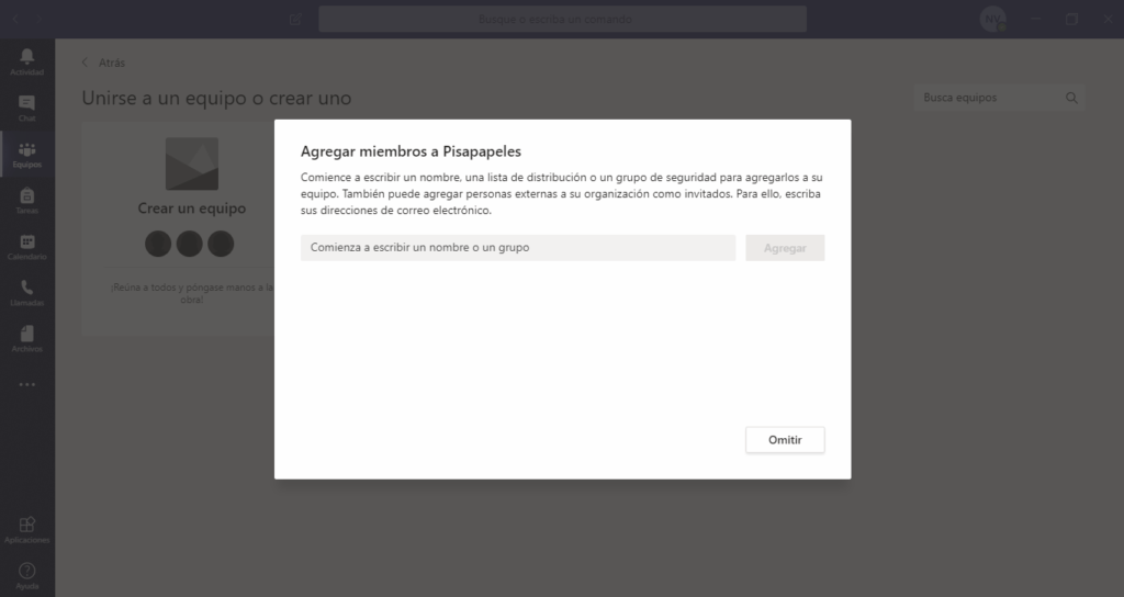 El último paso es agregar integrantes a nuestro equipo. Aquí podemos seleccionar a gente que tengamos en nuestros contactos, o bien, digitar los correos electrónicos respectivos para que reciban una invitación. También podemos omitir este paso, y hacerlo más adelante.