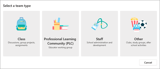 Cuando presionemos «Crear un equipo», si tenemos una cuenta de profesor, en primer lugar nos dará a escoger el tipo de equipo que queremos crear (una clase, una para administrativos, etcétera), si no somos profesores, nos llevará de inmediato a la ventana de los datos: nombre, descripción y la privacidad del team (si cualquier persona en mis contactos se puede unir, o solo vía invitación).