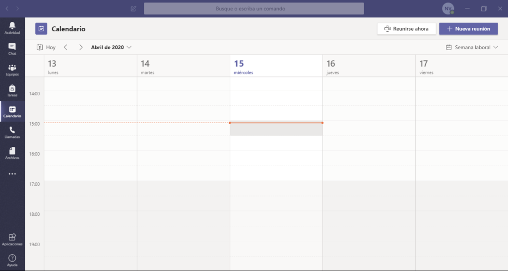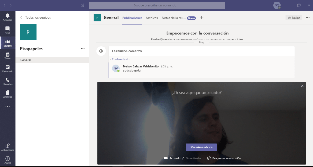 Para iniciar la videoconferencia, debemos dirigirnos al panel principal de nuestro equipo, y seleccionar la opción «reunirse ahora» (que está representado como una cámara de video), y que se ubica debajo de la caja de texto.