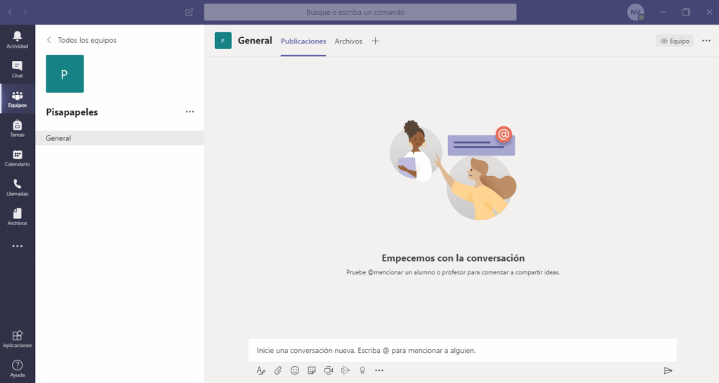 Una vez terminado esto, tendremos acceso al panel principal de nuestro equipo. Aquí tendremos un chat propio, donde podemos hablar, enviar archivos, iniciar llamadas, etcétera. También podemos crear diversos canales de comunicación, para distintos tópicos.