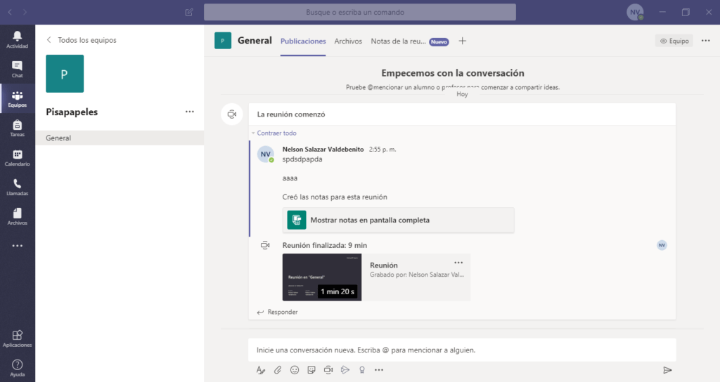 Una vez finalizada la llamada, en el chat principal de nuestro equipo nos saldrá un pequeño resumen de esta: algunos mensajes del chat de la llamada, las notas que se tomaron, y si aplica, se adjunta la grabación (la cual se tarda un poco en procesar, ya que se sube a Microsoft Stream).