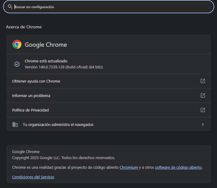Ingresa a la URL chrome://settings/help en Chrome y verifica la versión de tu navegador.