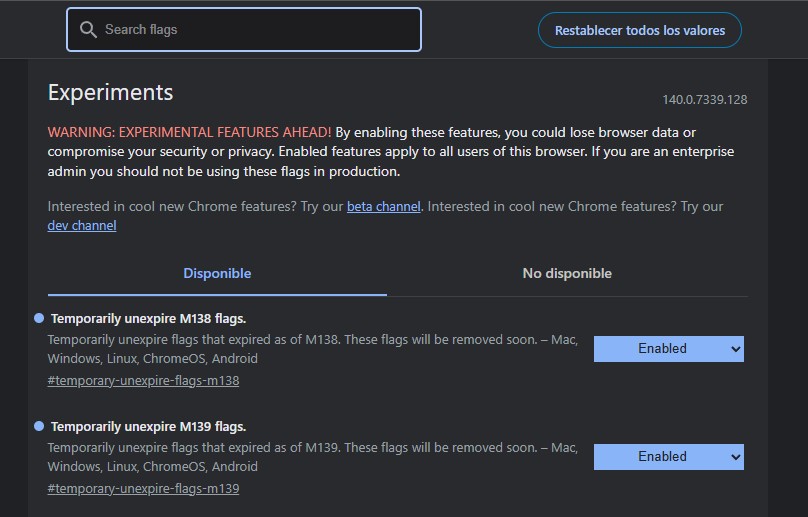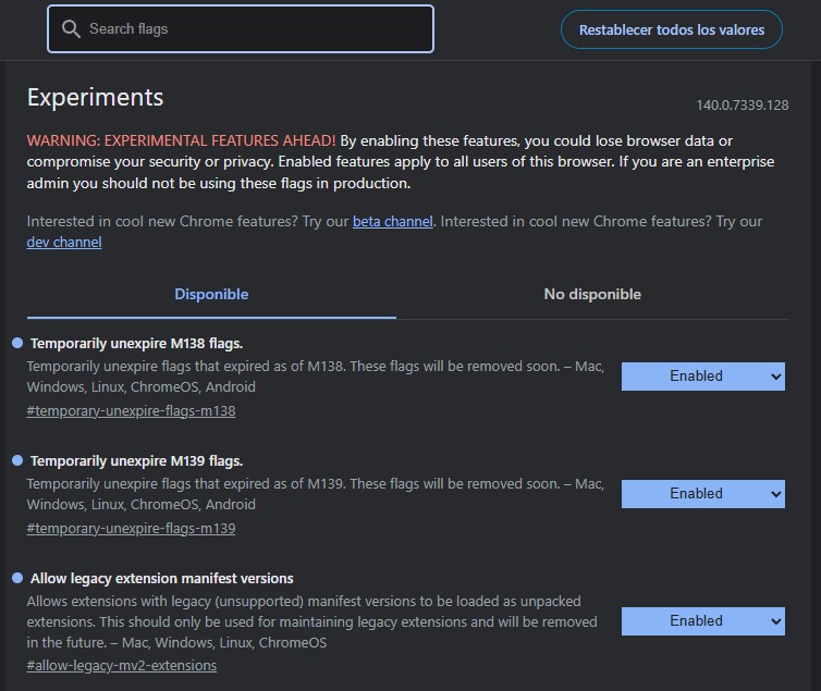 Si la versión de chrome empieza con 141 o mayor, ingresa a chrome://flags/ y busca las opciones Temporarily unexpire M138 flags, Temporarily unexpire M139 flags y Temporarily unexpire M140 flags. Activa ambas opciones y reinicia el navegador. Si la versión de tu navegador empieza con 139 o 138 no es necesario hacer este paso.