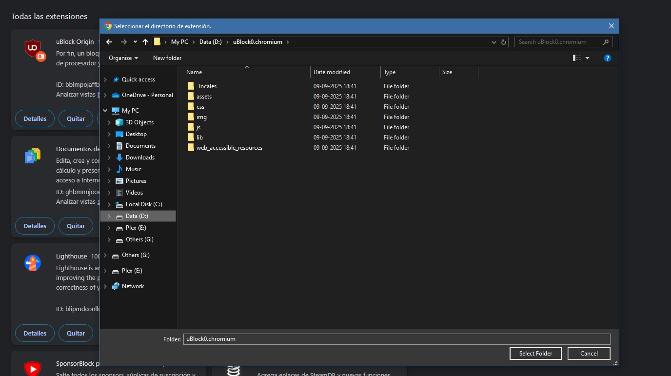 En la sección de extensiones (chrome://extensions/), selecciona Cargar extensión sin empaquetar y selecciona la carpeta uBlock0.chromium que descargaste.