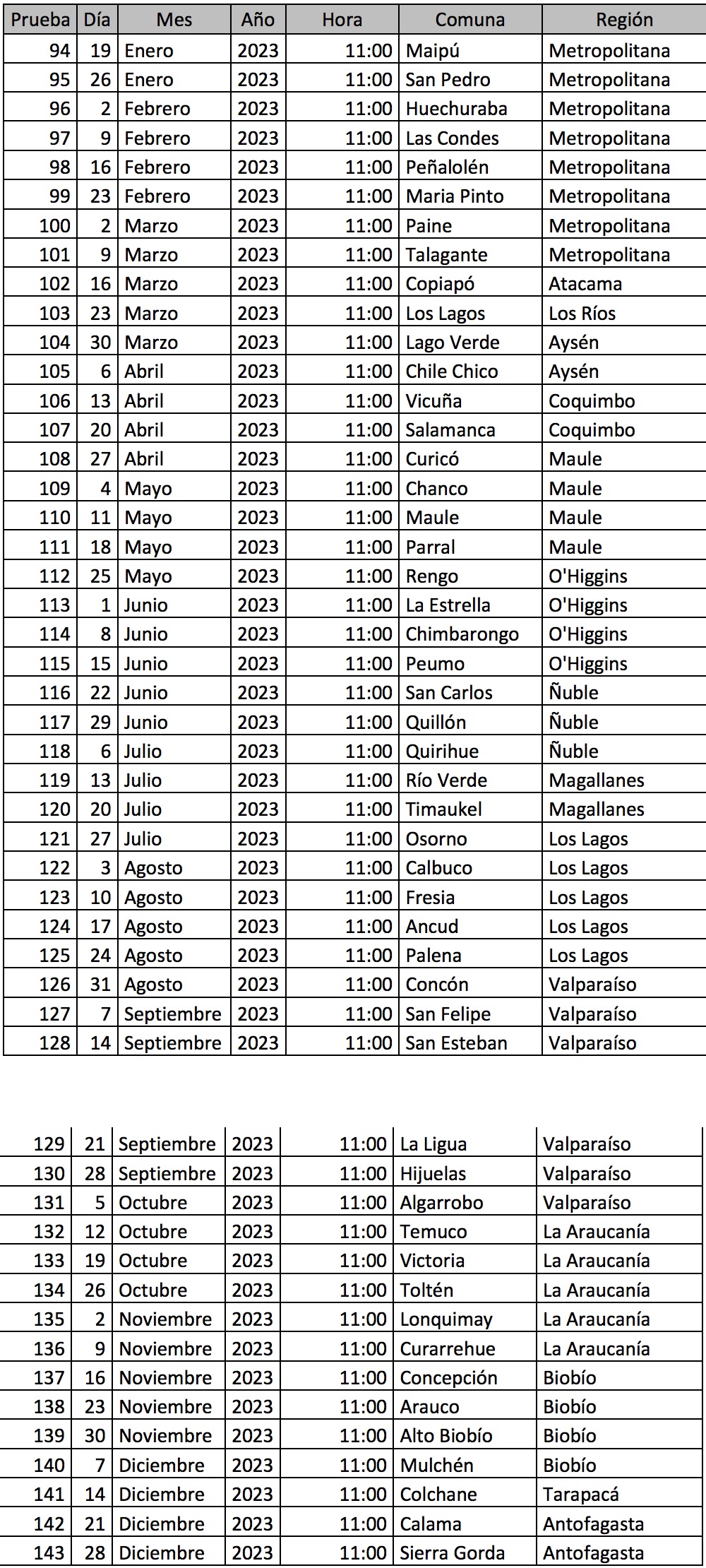 Sin embargo, no será la única prueba que se realizará, ya que todos los jueves de este año 2023 se realizará la misma prueba en diferentes comunas del país, justo a las 11:00 horas, tal y como sucedió hoy.