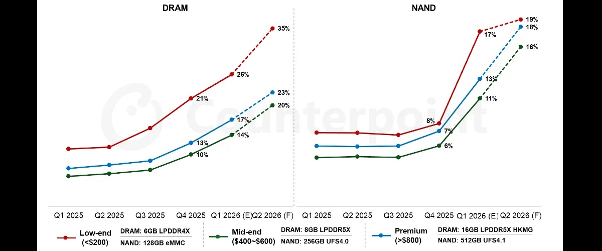 El impacto no es uniforme entre todos los segmentos del mercado. Los smartphones de gama baja son los más afectados, dado que el costo de la memoria representa una porción mucho mayor de su costo total de fabricación. En equipos económicos, el alza del costo de materiales por concepto de memoria llega al 25%, frente a un 15% en gama media y un 10% en gama alta. Históricamente, la memoria representaba entre el 10% y el 15% del costo total de fabricación de un smartphone.