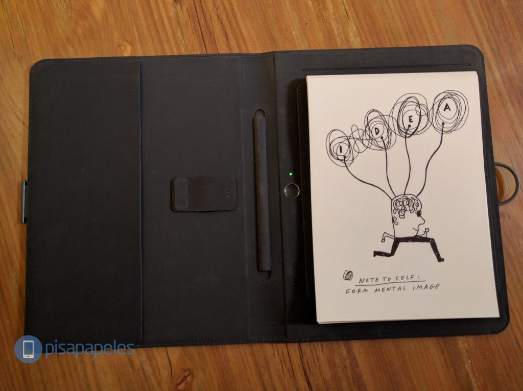 A simple vista notarás que estás ante una agenda común y corriente, y dentro de ella encontrarás un bloc de notas y un lápiz. Hasta ahí todo normal, pero la magia de esta agenda es que debajo de ella tiene un sistema que va registrando y guardando todo lo que haces con el lápiz sobre la hoja de papel. De hecho puedes usar cualquier hoja de papel.